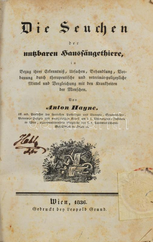 Hayne, Anton: Die Seuchen der nutzbaren Haussäugethiere, [A házi haszonállat emlősök járványai], in Bezug ihrer Erkenntniss, Ursachen, Behandlung, Vorbauung durch therapeutische und veterinär-polizeyliche Mittel und Vergleichung mit den Krankheiten der Menschen. Wien, 1836, Lepold Grund, VI+2+504 p.+ 2 (kihajtható táblák) t. 1. kiadás. Német nyelven. Korabeli kartonált papírkötés, kopott borítóval, a borítón címkével, a címlapon bélyegzéssel, az első 3 lap szélén kis sérüléssel, foltos lapokkal.