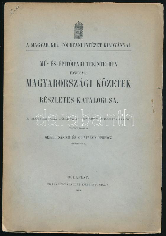 Mű- és építőipari tekintetben fontosabb magyarországi kőzetek részletes katalógusa. Összeáll.: Gesell Sándor és Schafarzik Ferenc. A Magyar Kir. Földtani Intézet kiadványai. Bp., 1885, M. Kir. Földtani Intézet (Franklin-ny.), XIX+(1)+139+(1) p. Egyetlen kiadás. Kiadói papírkötés, kissé sérült borítóval és gerinccel. A borítón és a címlapon Timkó Imre (1875-1940) agrogeológus, a Földtani Intézet munkatársa (rövid ideig helyettes igazgatója) autográf névbejegyzésével. Ritka!