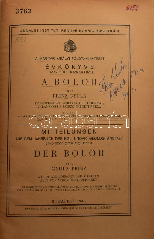 Prinz, Gyula: A Bolor. Der Bolor. Irta:- -. 130 szövegközti ábrával és 8 táblával, valamennyi a szerző eredeti rajza: Von - -. Mit 130 Abbildungen und 8 Tafeln alle von Verfasser Gezeichnet. A Magyar Királyi Földtani Intézet évkönyve XXXV. kötet 6 (záró) füzet.