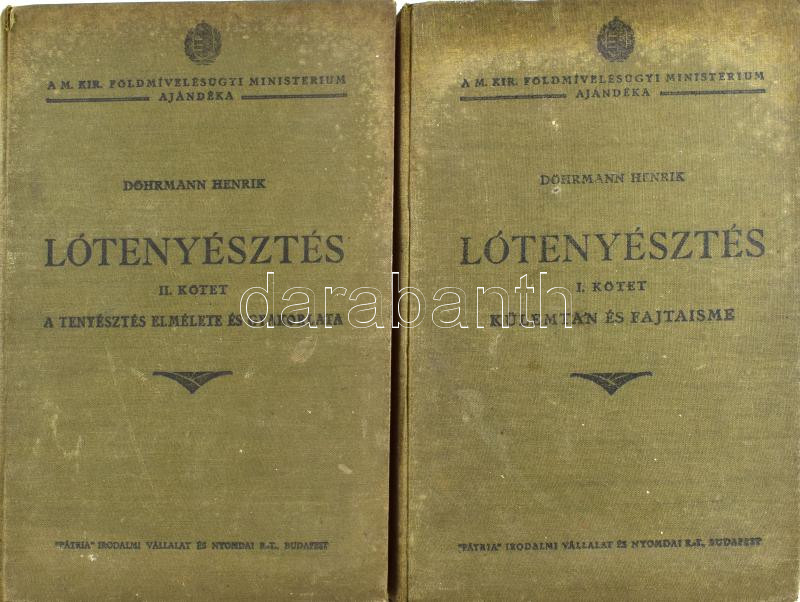 Döhrmann Henrik: Lótenyésztés I-II. köt. I. kötet: Külemtan és fajtaisme. II. köt.: A tenyésztés elmélete és gyakorlata. Bp., 1922., Országos Magyar Gazdasági Egyesület,("Pária"-ny.), 251 p.; 258 p. Első kiadás. Szövegközti fekete-fehér képekkel illusztrált. Kiadói egészvászon-kötés, kopott, foltos borítóval, kissé foltos lapokkal, az I. kötetben a tartalomjegyzék lapja javított (3/4 p.), a II. kötet gerincén apró sérüléssel.