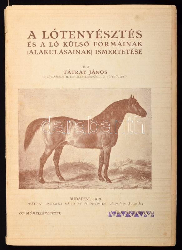 Tátray János: A lótenyésztés és a ló külső formáinak (alakulásainak) ismertetéseBudapest, 1918, Pátria' Irodalmi Vállalat és Nyomdai Részvénytársaság kiadása és nyomása, IV p. + 208 p. + [5] t.: ill. Első kiadás. Kiadói papírborítóval. A fűzésnél elvált a borítótól a könyvtest.