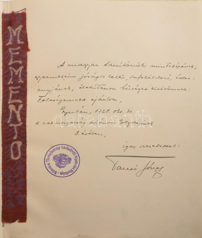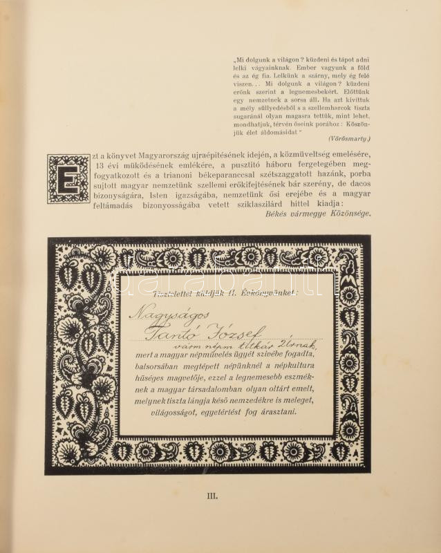 Békésvármegye Törvényhatósági Iskolánkívüli Népművelési Bizottságának I. évkönyve. A népművelés története, szervezete. Szerk.: Tantó József. Átnézte: Daimel Sándor. Számozott (25./25), a kötet szerkesztője, Tantó (Tanthó) József (1888-1973), Békés vármegye népművelési titkára által felesége részére dedikált példány (,,A magyar tanítónők mintaképének, gyermekeim jóságos lelkű, önfeláldozó édesanyjának, életútamon hűséges kísérőmnek: Feleségemnek ajánlom [...]"). Békéscsaba, 1928, ,,Kőrösvidék"-ny., 8 sztl. lev.+ 192 p.+ 16 t.+ 1 (Békés vármegye kihajtható térképe) t. Dombornyomott címerrel díszített egészbőr-kötésben, nagyrészt jó állapotban.
