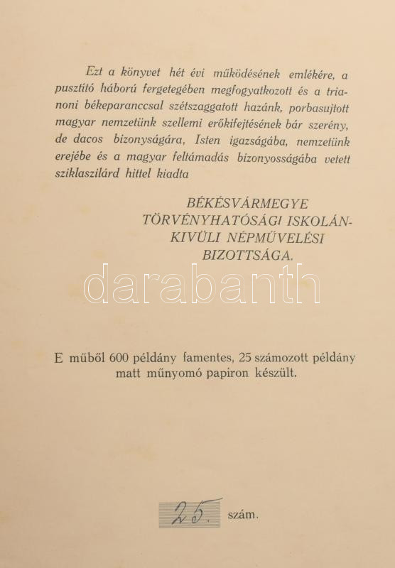 Békésvármegye Törvényhatósági Iskolánkívüli Népművelési Bizottságának II. évkönyve. Szerk.: Tantó József. Számozott (3./710), a szerkesztő, Tantó József részére névre szóló tiszteletpéldány. [Gyula, 1934, Dobay János-ny.], XI+(1)+143+(7) p. Dombornyomott címerrel díszített, aranyozott egészvászon-kötésben, nagyrészt jó állapotban.