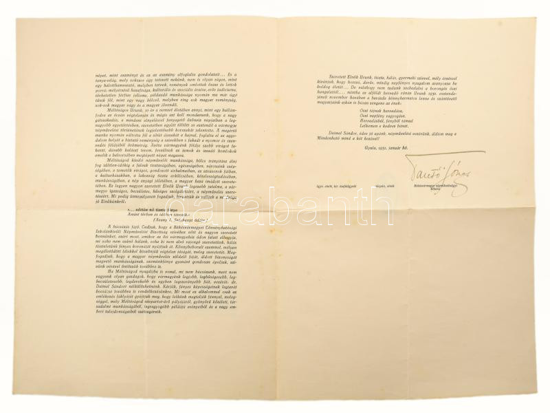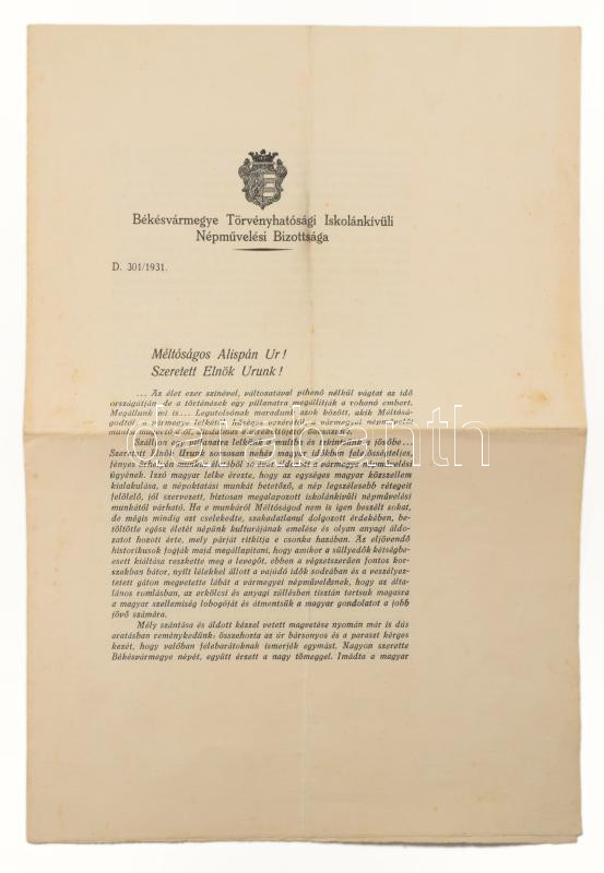 Hozzá Békésvármegye Törvényhatósági Iskolánkívüli Népművelési Bizottságának Daimel Sándor alispánhoz, a bizottság elnökéhez címzett, nyomtatott levele (1931), Tantó József autográf aláírásával, 2 sztl. lev.