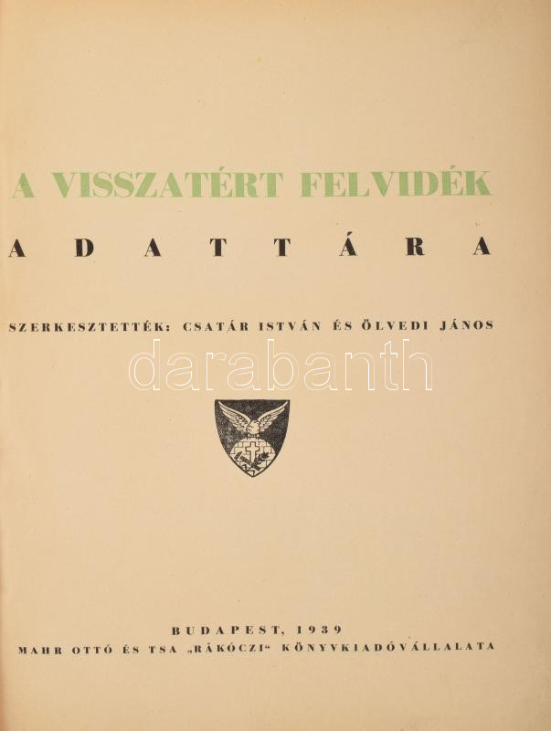 Csatár István - Ölvedi János: A visszatért Felvidék adattára. Bp., 1939, Mahr Ottó és Tsa "Rákóczi" Könyvkiadóvállalata. 408+72p. Kiadói félvászon kötés, gerinc kissé sérült, kötéstábla sérült, kopottas állapotban.