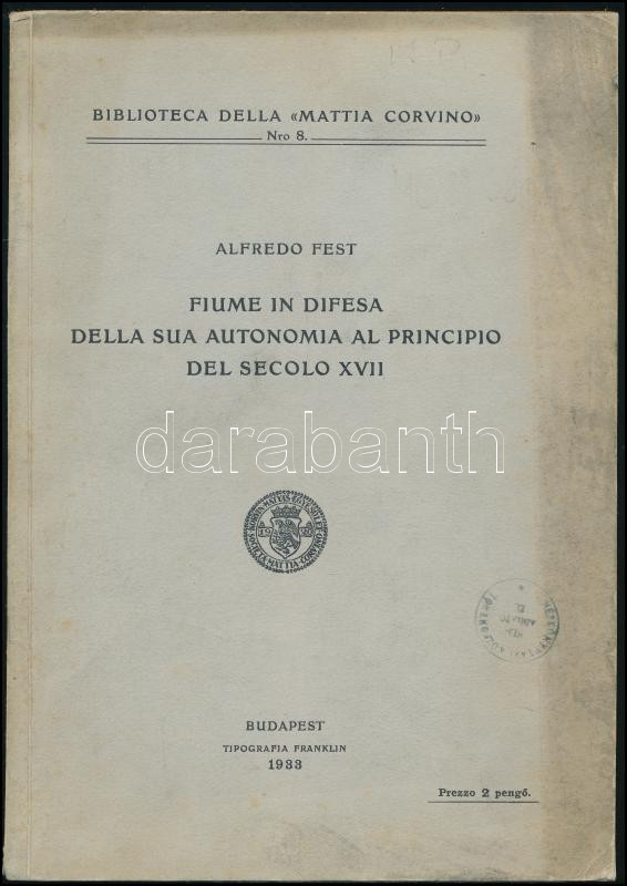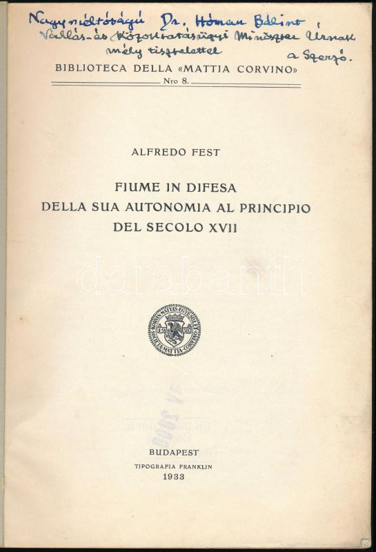 Fest, Alfredo: Fiume in difesa della sua autonomia al principio del secolo XVII. Bp., 1933, Franklin. Hóman Bálint részére DEDIKÁLT! Kiadói foltos papírkötés, felvágatlan példány.