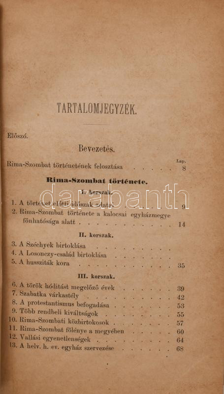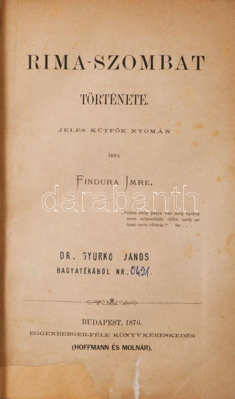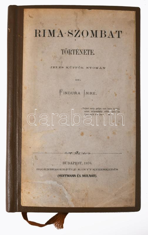 Findura Imre: Rima-Szombat története. Jeles kútfők nyomán írta: - -. Bp., 1876, Eggenberger (Hoffmann és Molnár),(M. Kir. Egyetemi Nyomda), 8+108 p. 1. kiadás. Átkötött modern egészvászon-kötés, restaurált címlappal, néhány kissé foltos lappal, ex libris bélyegzéssel.