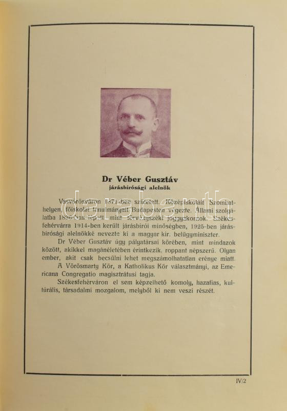 Hirn László: Fejérmegyei fejek. Fejérvármegye tíz évvel Trianon után. Szerk.: - - hírlapíró. Magyar városok, vármegyék társadalmi emlékalbuma IV. Bp., 1929. Magyar Vármegyék és Városok Társadalmi Emlékalbuma Kiadóvállalat, [400] p. Fényképekkel illusztrált életrajzok települések szerint rendezve. Kiadói aranyozott egészvászon-kötés, Popper és Csasznik-kötés, kissé kopott borítóval, a gerincen kis sérüléssel, foltos lapélekkel, jó állapotban.