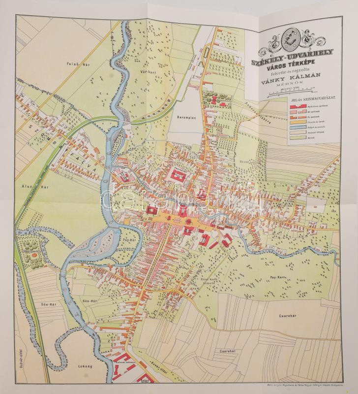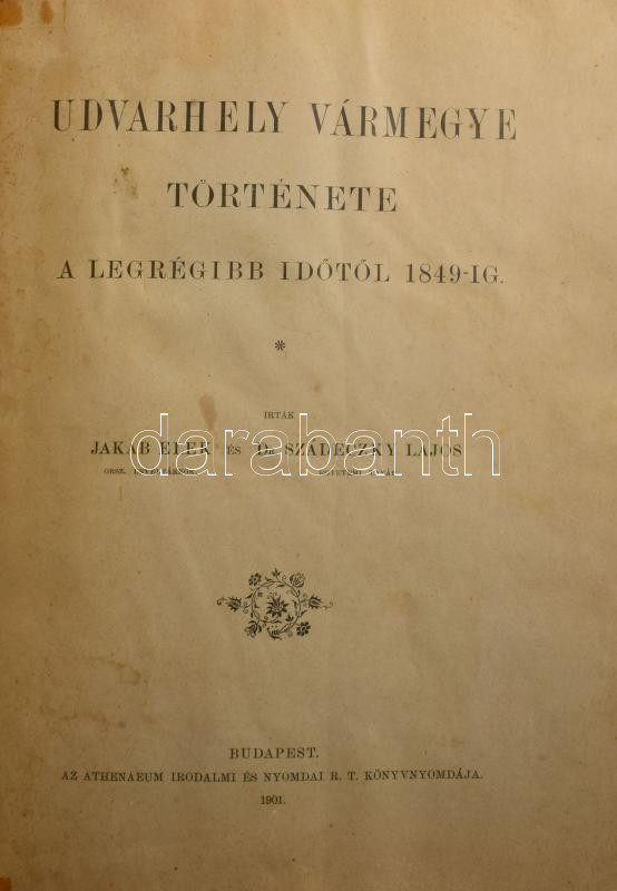 Jakab Elek - Dr. Szádeczky Lajos: Udvarhely vármegye története a legrégibb időtől 1849-ig. Bp., 1901., Athenaeum, IV+583 p.+1 (színes, kihajtható térkép: Udvarhely vármegye hegy- és vízrajzi viszonyai térképe, átdolgozta: Homolka József, 1:225,000, Bp., 1896, Kogutowicz és Társa Magyar Földrajzi Intézete-ny., foltos, kis szakadással, 34,5x40,5 cm) t. + 2 (hiányzó két térképet, a kötet végén mellékletként, igényes fénymásolattal pótolták) t.