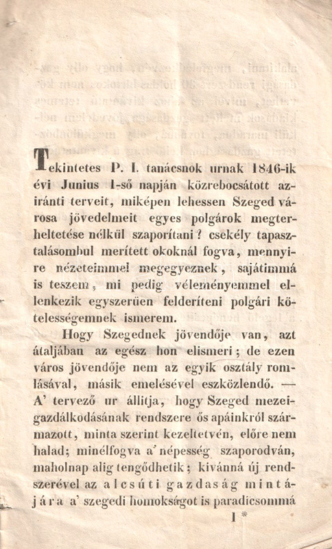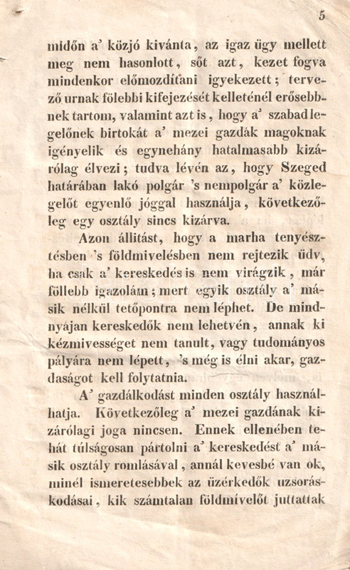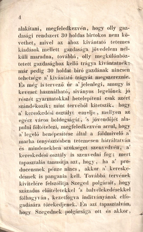 Stílusmutatvány: "Hogy Szegednek jövendője van, azt átaljában az egész hon elismeri; de ezen város jövendője nem az egyik osztály romlásával, másik emelésével eszközlendő. A' tervező úr állítja, hogy Szeged mezei gazdálkodásának rendszere ős apáinkról származott, minta szerint kezeltetvén, előre nem halad; minélfogva a' népesség szaporodván, maholnap alig tengődhetik; kívánná új rendszerével az alcsúti gazdaság mintájára a' szegedi homokságot is paradicsommá alakítani, megfeledkezvén, hogy olly gazdasági rendszert 30 holdas birtokos nem követhet, mivel az ahhoz kívántató tetemes kiadások mellett gazdasága jövedelem nélkül maradna, továbbá, olly megkülönböztetett gazdasághoz kellő trágya is kívántatnék; márpedig 30 holdat bíró gazdának nincs tehetsége a' kívántató trágyát megszerzenie. És mégis a tervező úr a' jelenlegi amúgy is keveset használható, siványos legelőnek jó részét gyarmatosokkal betelepíteni csak azért szándékozik: mint tervéből kitetszik, hogy a' kereskedési osztályt emelje, mellyen az egész város boldogságát, 's jövendőjét alapulni föltételezi, megfeledkezvén arrúl, hogy a' legelő benépesítése által a földmívelő a' marhatenyésztésben tetemesen hátráltatván és mindenekben szükséget szenvedvén, a' kereskedési osztály is szenvedni fog; mert tapasztalás tanúsítja azt, hogy ha a' producensnek pénze nincs, akkor a' kereskedésnek is pangania kell".