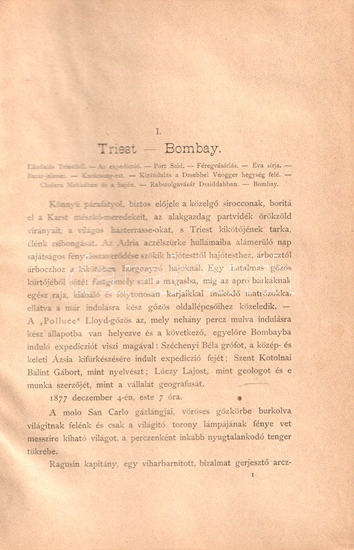 Gustav Kreitner (1847-1893) osztrák térképész beszámolója Széchenyi Béla magyar főrend 1877-1880 között lezajlott ázsiai utazásáról. Az expedíció vezetője, Széchenyi Béla Lóczy Lajos és a szerző társaságában hajózott Indiába, majd a jávai szigetvilág érintésével Kína keleti partjait, Japánt, majd a szárazföldi Kínán áthaladva elérték a mongol és a tibeti határt. A felfedező csapat eredeti szándéka szerint Tibeten keresztül jutott volna vissza Indiába, ám a tibeti hatóságok tiltása miatt kelet felé kellett kerülniük, így végül a Kék-folyó mentén, majd Burmán keresztül jutottak vissza hajójukhoz. Az oldalszámozáson belül igen gazdag képanyaggal ellátott utazási beszámoló egzotikus kultúrákként örökíti meg az érintett országokat, a néprajzi megfigyelésekben gazdag beszámoló előszeretettel emlékezik meg a furcsaságokról, előítéletekről és az individualista szemlélő számára felfoghatatlan társadalmi jelenségekről is; beszámolónk egyszerre figyeli meg a bürokrácia összetettségét és az országok technikai elmaradottságát, ám a keleti építőművészet, képzőművészet és előadó-művészet nívóját kétségtelenül elismeri.