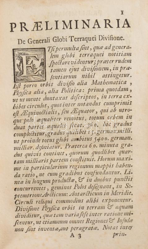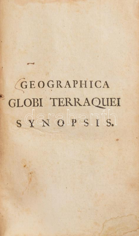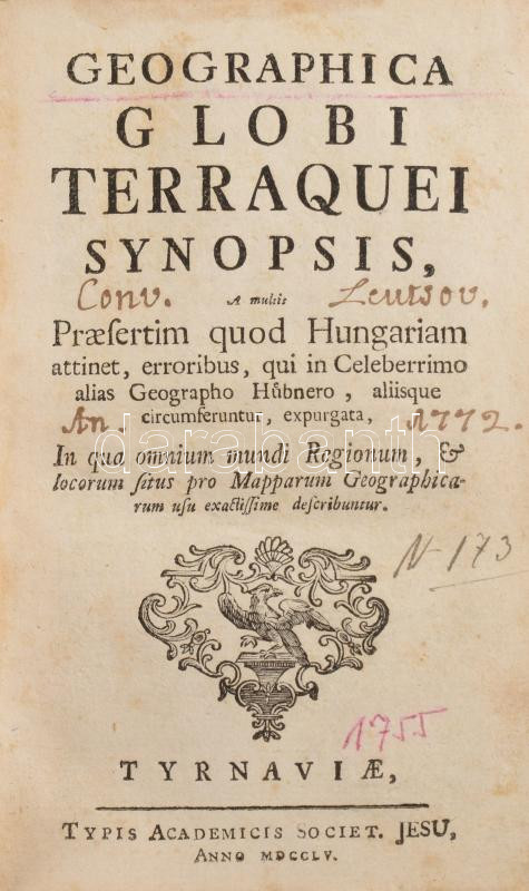 [Nedeczky László]: Geographica Globi terraquei synopsis, a multis praesertim, quod Hungariam attinet, erroribus, qui in celeberrimo alias Geographo Hübnero, aliisque circumferuntur, expurgata, in qua omnium mundi Regionum, & locorum situs pro mapparum geographicarum usu exactissime describuntur. Tyrnaviae [Nagyszombat], 1755, Typis Academicis Societ. Jesu, 2 sztl. lev. +353+1 p.+21+4 sztl. Latin nyelven. Korabeli javított gerincű egészbőr-kötés, kopott borítóval, foltos lapokkal, a címlapon bejegyzésekkel és az utolsó 5 lapon kézírásos jegyzetekkel, bejegyzésekkel.