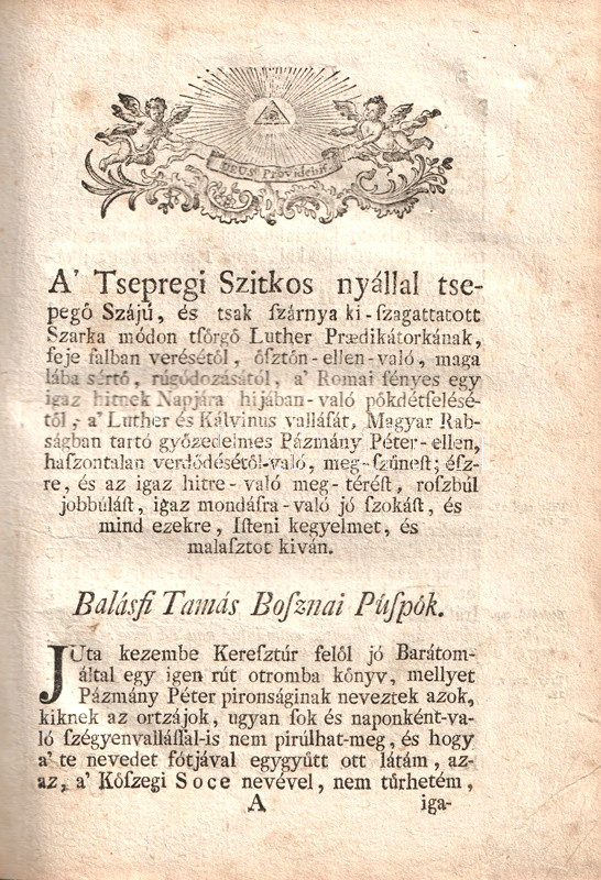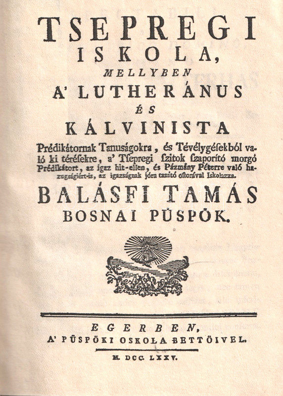 Tsepregi iskola, mellyben a' lutheránus és kálvinista Prédikátornak Tanuságokra, és Tévélygésekből való ki térésekre, a' Tsepregi szitok szaporító morgó Prédikátort, az igaz-hit ellen, és Pázmány Péterre való hazugságiért-is, az igazságnak jóra tanító ostorával Iskolazza Balásfi Tamás.