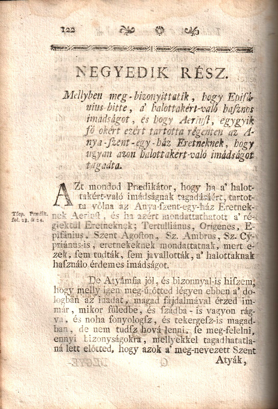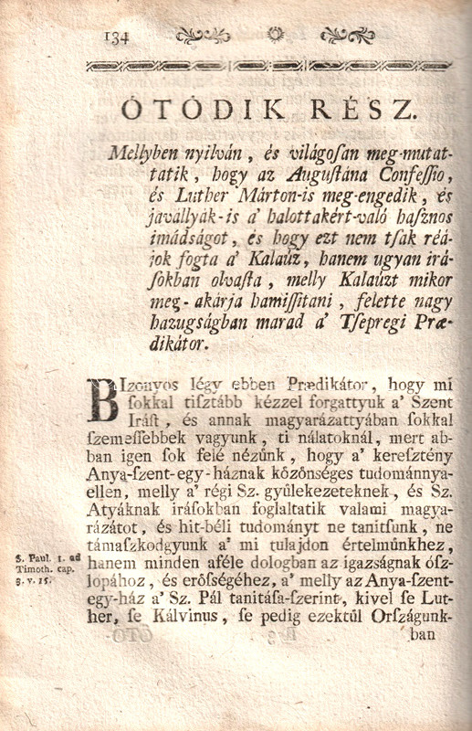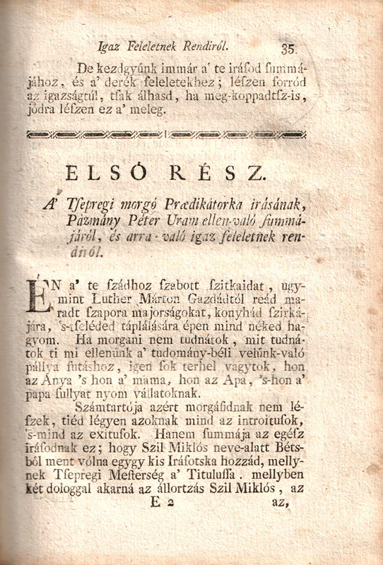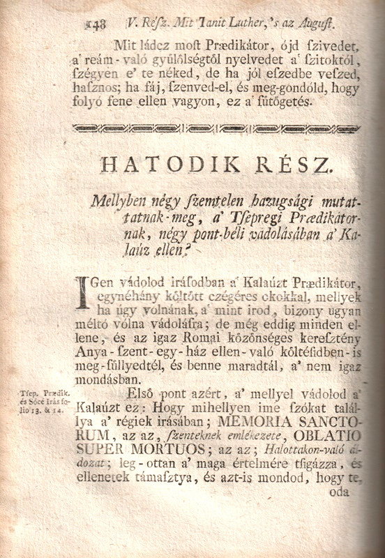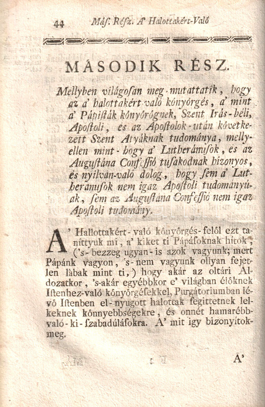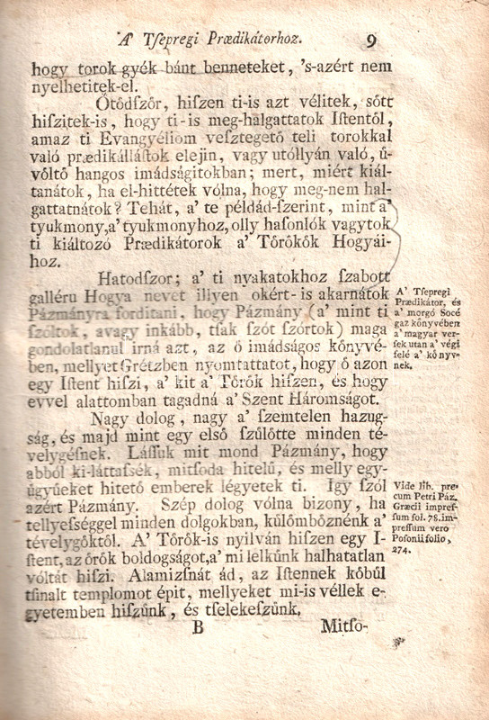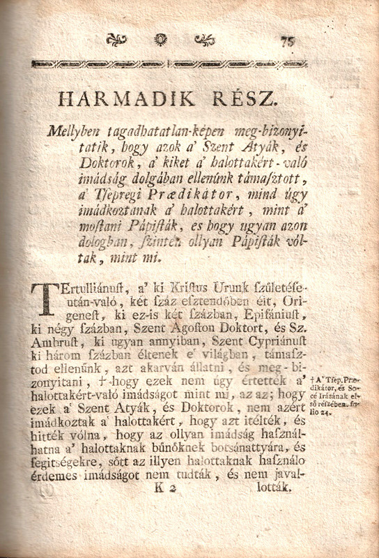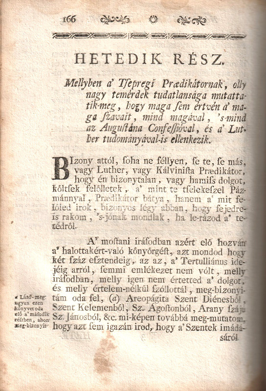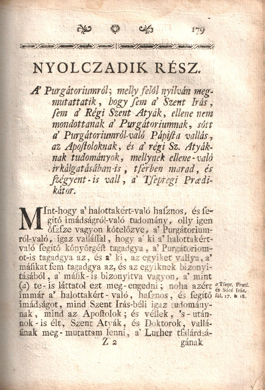Második kiadás. Példányunk címlapja merített papírra készült másolattal pótolt. Az erdélyi unitárius családból származó, katolizált, Nagyszombatban tanult, Pázmány Péter feltétlen hívének számító Balázsfy Tamás (1580-1625) boszniai címzetes püspök művének első kiadása Pozsonyban, 1616-ban jelent meg. Szenvedélyes, személyeskedésektől sem mentes stílusban megírt hitvitázó irata Zvonarits Imre evangélikus lelkész előző évi (1615-ben megjelent), "Pázmány Péter pironsági" című pamfletével vitázik, és kétségbe vonja a csepregi evangélikus prédikátor Zvonarits Imre tisztességét, tanultságát, valamint elmebéli képességeit. A vita a halottakért mondott ima, a szentek tisztelete, a purgatórium léte és hagyományai körül forog, a csepregi prédikátor megtámadásának pedig nem csupán azért volt jelentősége, mert az előző évben kiadott pamflete magát Pázmányt támadta, hanem azért is, mert a korban Sopron, Sárvár mellett Csepreg mezőváros is komoly evangélikus bástyának számított, mely tüskének tűnt a rekatolizáció mellett elkötelezett, közeli Bécs oldalában. (Néhány évvel később, 1621-ben a császári hadak komoly vérengzést végeztek Csepregen, melynek során a templomba menekült híveket prédikátorukkal együtt lemészárolták, véget vetve Csepreg evangélikus iskolaközponti mivoltának.)
