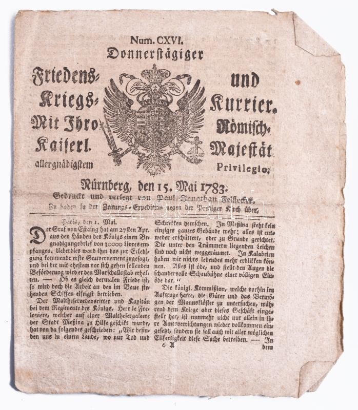 Benne XVIII. század végi folyóiratokkal: 1777-1789 Friedens- und Kriegs-Kurier 3 száma (Num. CCLX (1777. okt. 30), Num. CXVI (1783. május 15.), Num. CLXXXII (1789. július 31.) Nürnberg, 1777-1789, Paul Jonathan Felßecker,német nyelven. 3x2 sztl. lev.