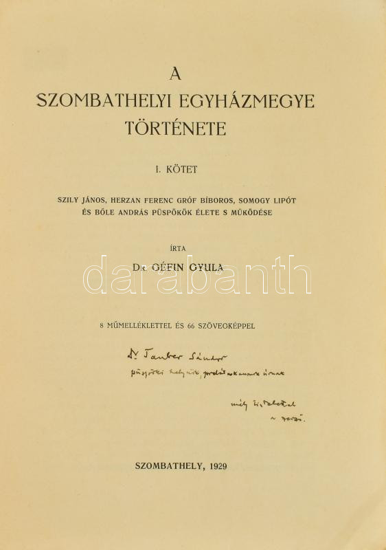 Géfin Gyula: A szombathelyi egyházmegye története I-III. kötet. Szerk.: Dr. - -. A szerkesztő, Géfin Gyula (1889-1973) teológiai tanár, egyháztörténész által Tauber Sándor (1868-1935) teológiai doktor, a szombathelyi papnevelő-intézet aligazgatója és teológiai tanár részére DEDIKÁLT példány. "Dr. Tauber Sándor püspöki helynök, prelátus kanonok úrnak mély tisztelettel a szerző." (Az I. kötet címlapján.)