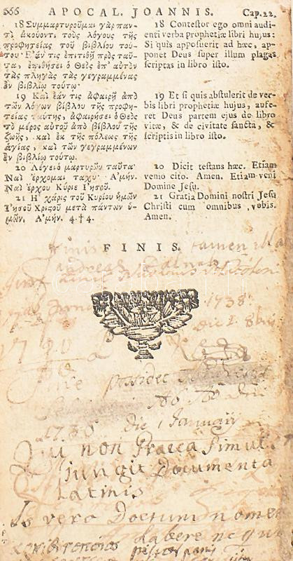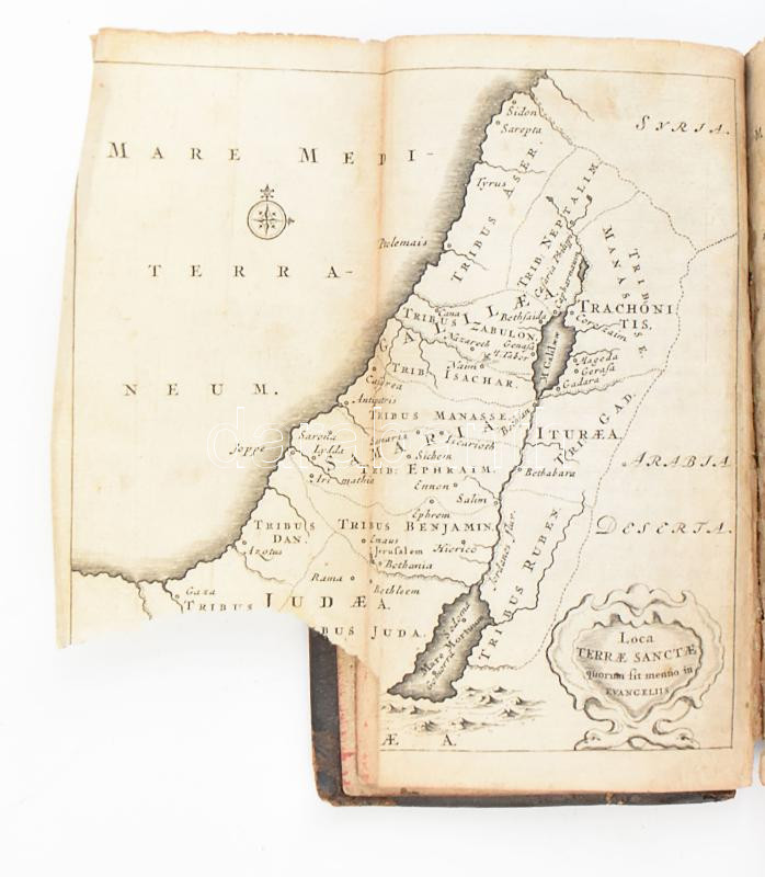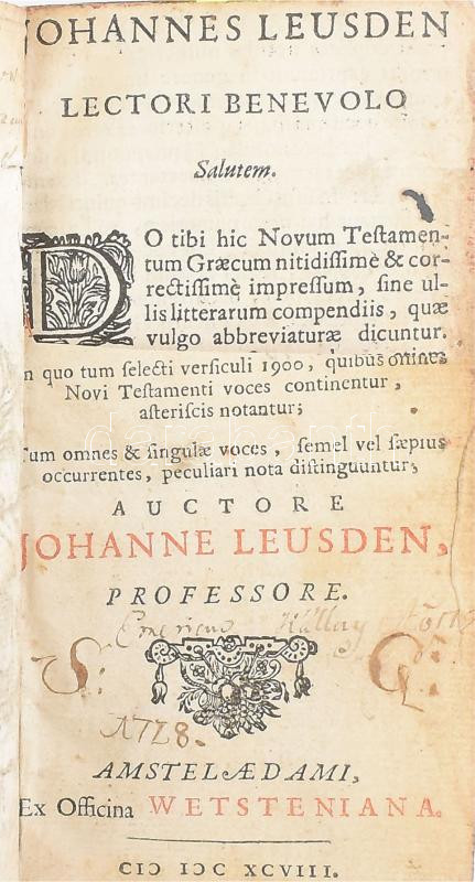 Johannes Leusden (1624-1699): He Kaine Diatheke = Novum testamentum cum versione Latina Ariae Montani, in quo tum selecti versiculi 1900, quibus omnes Novi Testamenti voces continentur, astericis notantur; ... Amstelaedami [Amsterdam], 1698, Ex Officiana Westeniana, 1 (díszcímlap) t. +6+666 p.+ 1 (Loca terrae sanctae quorum sit mentio in Evangeliis, hiányos 12x11,5 cm) t. Görög és latin nyelven. Korabeli egészbőr-kötés, kopott borítóval, sérült, hiányos gerinccel, sérült díszcímlappal és hiányos címlappal, két helyen javítással, foltos lapokkal, aláhúzásokkal és néhány bejegyzéssel, a díszcímlap hátoldalán és az utolsó lapon bejegyzésekkel, hiányos térképpel.