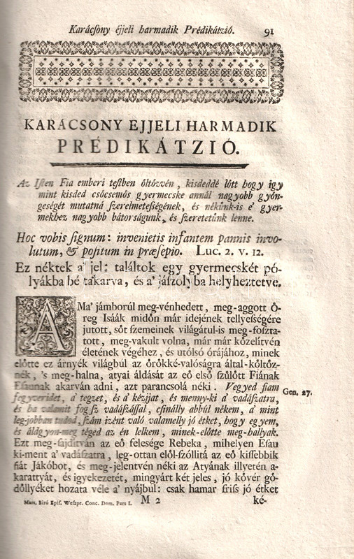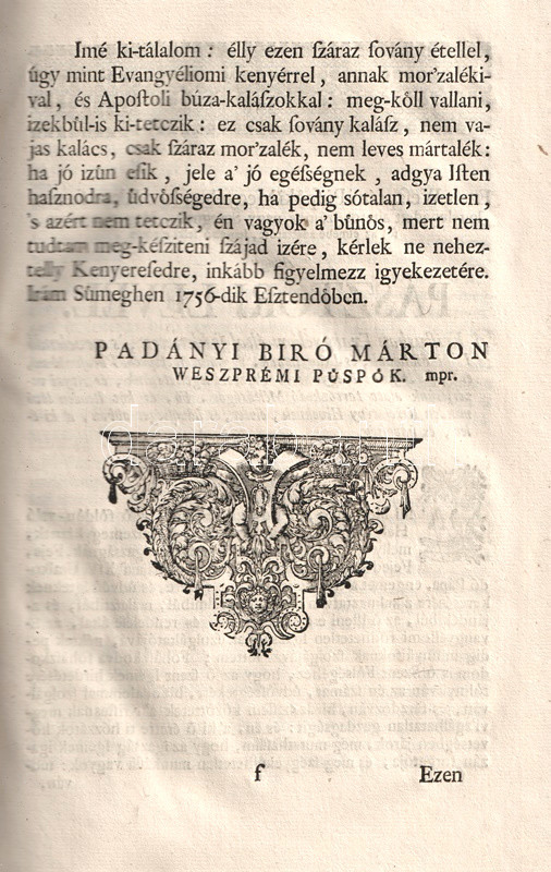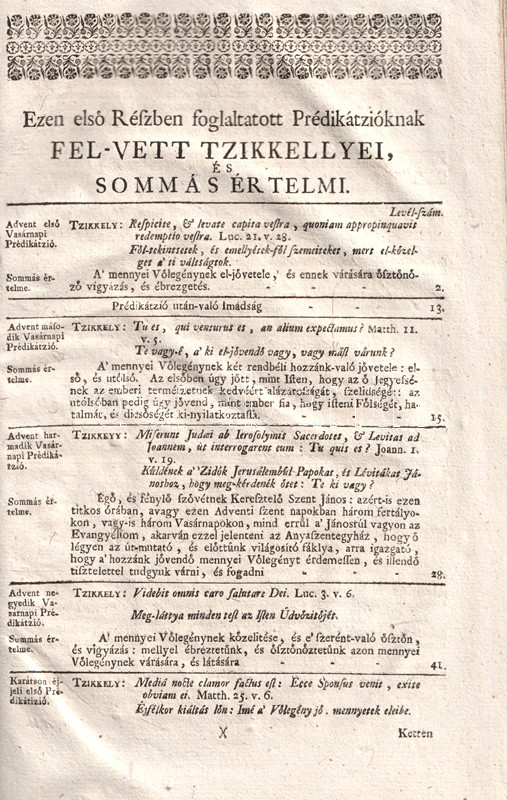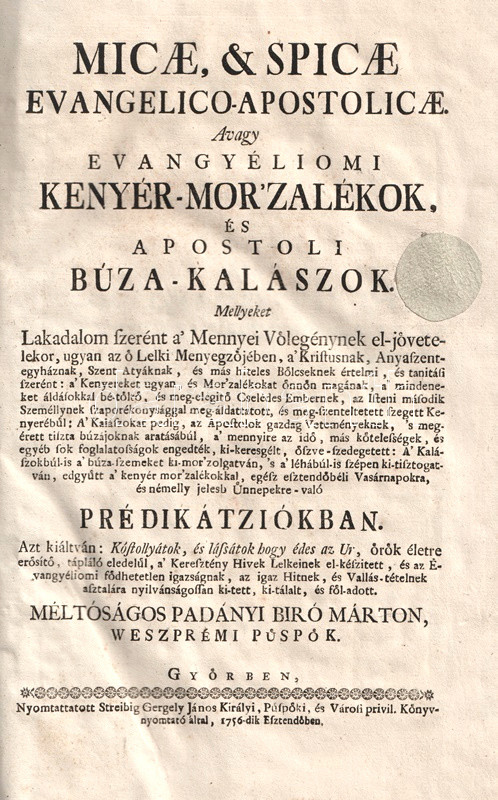 Micae, & spicae evangelico-apostolice. Avagy Evangyéliumi kenyér-mor'zalékok és Apostoli búza-kalászok. Mellyeket Lakadalom szerént a' Mennyei Vőlegénynek el-jövetelekor, ugyan az ő Lelki Menyegzőjében, a' Kristusnak, Anyaszentegyháznak, Szent Atyáknak, és már hiteles Bölcseknek értelmi, és tanitási szerént: a' Kenyereket ugyan, a' Mor'zalékokat önnön magának, a' mindeneket áldásokkal bé-töltő, és meg-elégitő Cselédes Embernek, az Isteni második Személlynek szaporékonysággal meg-áldattatott, és meg-szenteltetett szegett Kenyerébül: A' Kalászokat pedig, az Apostolok gazdag Veteményeknek, 's meg-érett tiszta búzájának aratásából, a' mennyire az idő, más kötelességek, és egyéb sok foglalatosságok engedték, ki-keresgélt, öszve-szedegetett: A' Kalászokbúl-is a' búza-szemeket ki-morzsolgatván, 's a' léhábúl-is szépen ki-tisztogatván, edgyütt a' kenyér mor'zalékokkal, egész esztendőbéli Vasárnapokra, és némelly jelesb Ünnepekre-való Prédikátziókban [. . .] az igaz Hitnek, és Vallás-tételnek asztalára nyilvánosságossan ki-tett, ki-tálalt, és föl-adott Padányi Biró Márton.