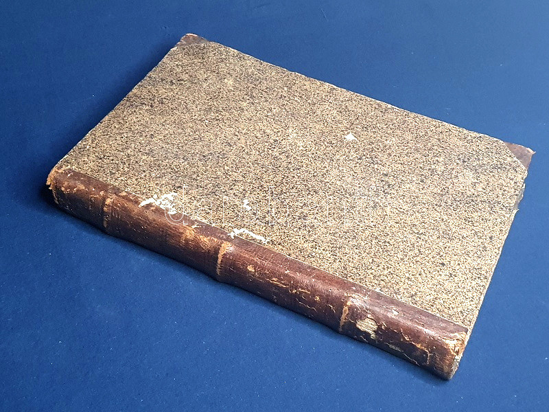 Három bordára fűzött, vaknyomásos, enyhén hiányos, kissé sérült gerincű korabeli félbőr kötésben, a gerincen apró szúrágásnyomokkal. Jó példány.