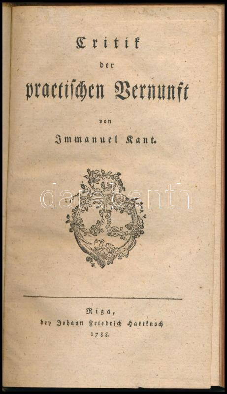 Immanuel Kant: Critik der practischen Vernunft. [Kritik der praktischen Vernunft /A gyakorlati ész kritikája.] Riga, 1788, Johann Friedrich Hartknoch, 292 p. Első kiadás. Német nyelven. Korabeli félpergamen-kötés, festett lapélekkel, kopott, foltos borítóval, az előző szennylapon kis hiánnyal, de alapvetően belül jó állapotban.