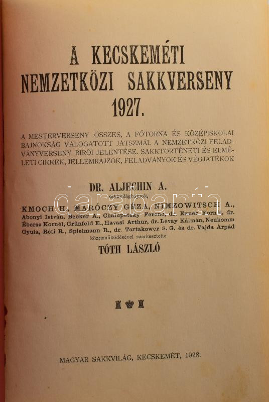 A kecskeméti nemzetközi sakkverseny 1927. A mesterverseny összes, a főtorna és a középiskolai bajnokság válogatott játszmái. A nemzetközi feladványverseny bírói jelentése. Sakktörténeti és elméleti cikkek, jellemrajzok, feladványok és végjátékok. Szerk.: Tóth László. Kecskemét, 1928, Magyar Sakkvilág, XXIV+308+2 p.+4 t. Átkötött egészvászon-kötés, kopott, kissé foltos borítóval.