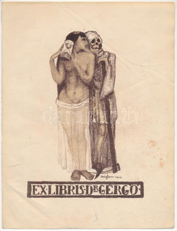 Sassy Attila (1880-1967): Ex libris dr. Gergő, 1913. Litográfia, papír. jelzett a litográfián (Aiglon és Sassy). Lap széle kissé foltos. Hajtásnyommal. 20x14 cm. Ritka!