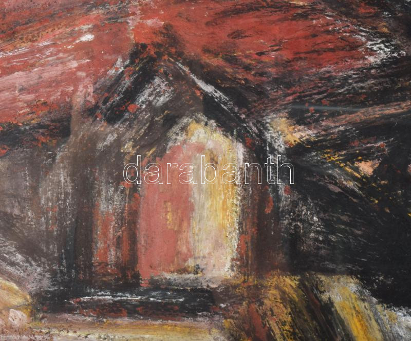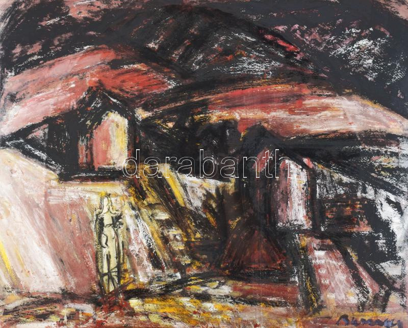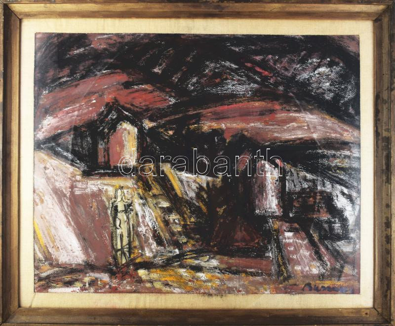 Barcsay Jenő (1900-1988): Dombos táj alakkal. Vegyes technika, karton. Jelezve jobbra lent: Barcsay. Aukcionálva: Kieselbach Galéria, 65. Nyári Aukció, 2021.06.14, 191. tétel. Proveniencia: Vásárlás BÁV-tól, 1980.XII.6. kelt. jegyzékkel és hátoldalán korabeli BÁV címkével. Üvegezett fakeretben, 56×71 cm