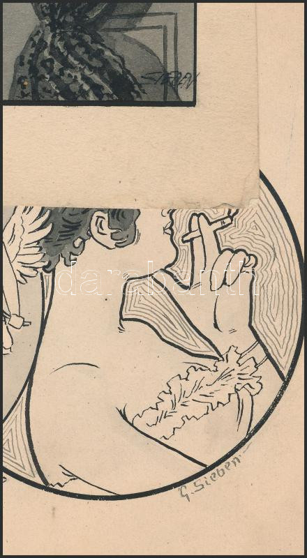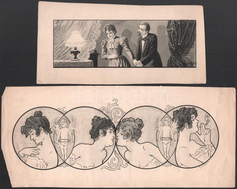 Gottfried Sieben (1856-1918): össz. 5 db szecessziós illusztráció. Lavírozott tus, papír, 2 db jelzett. Kissé kopott paszpartuban. Egyiken lapszéli szakadásokkal. 7x20,5 és 23x16 cm közötti méretekben. / Gottfried Sieben (1857-1901), Austrian painter: 5 pcs of art nouveau illustrations. Ink on paper, two of them signed. one of them with tears on the edges. Between 7x20,5 and 23x16 cm