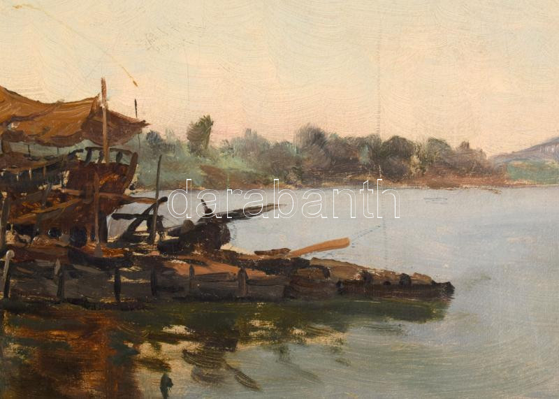 Beschreibung: Györök Leó (1847-1899): Trogiri részlet. Olaj, vászon. Jelezve jobbra lent. Dekoratív, kissé kopott fakeretben, 29,5×51,5 cm