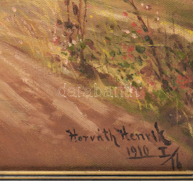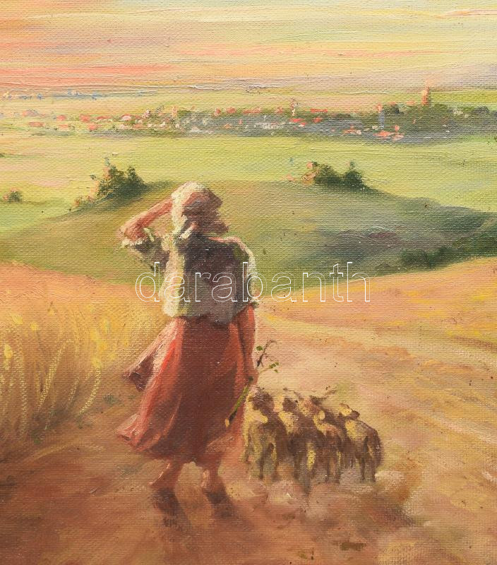 Horváth Henrik (1840-): Pásztorlány bárányokkal a világosi dombokon, háttérben Arad panorámája, 1910. Olaj, vászon. Jelezve jobbra lent. Dekoratív fakeretben. 57x70 cm. Horváth Henrik a bécsi és a müncheni Képzőművészeti Akadémián végezte tanulmányait. Rajzpedagógusként Nagybányán működött: Réti István és Thorma János is tanítványai közé tartozott. / oil on canvas, signed, framed