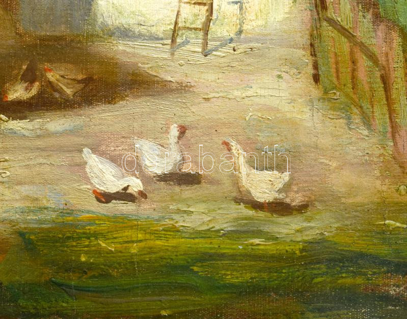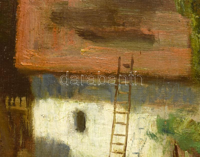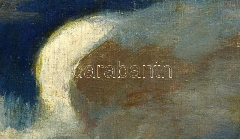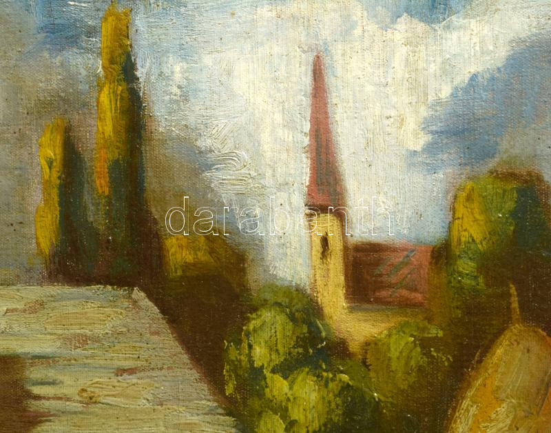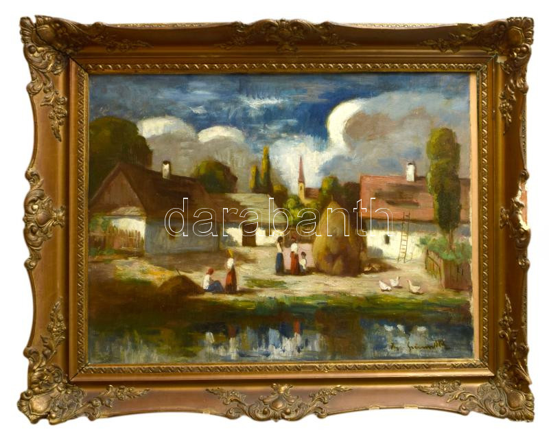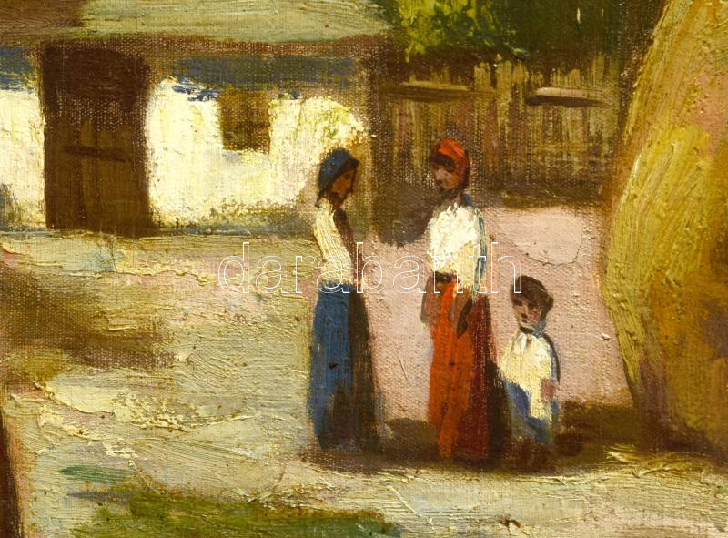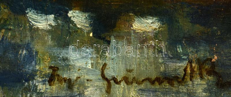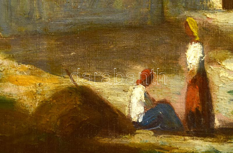 Iványi Grünwald Béla (1867-1940): Tájkép alakokkal. Olaj, vászon, jelezve jobbra lent. A tételhez tartozik egy levél, amelyben Iványi Grünwald Béla igazolja a festmény eredetiségét a hátoldalán található számra hibatkozva. Dekoratív, sérült fakeretben. 61x80 cm