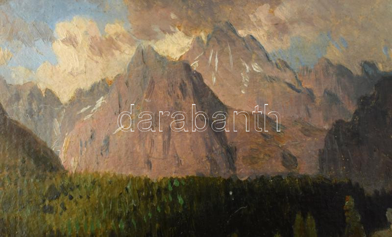 Molnár József (1821-1899): Hegyvidéki táj (Tátra?). Olaj, karton, jelezve jobbra lent. Restaurált. Sarkában apró sérüléssel. Hordozótól elvált hátlapon "Molnár István-tól való a kép" felirattal és különálló papírlapon "Igazolvány, h. a kép Molnár J. tól való" és olvashatatlanc aláírás. Restaurálási dokumentációval. 15,5x24 cm