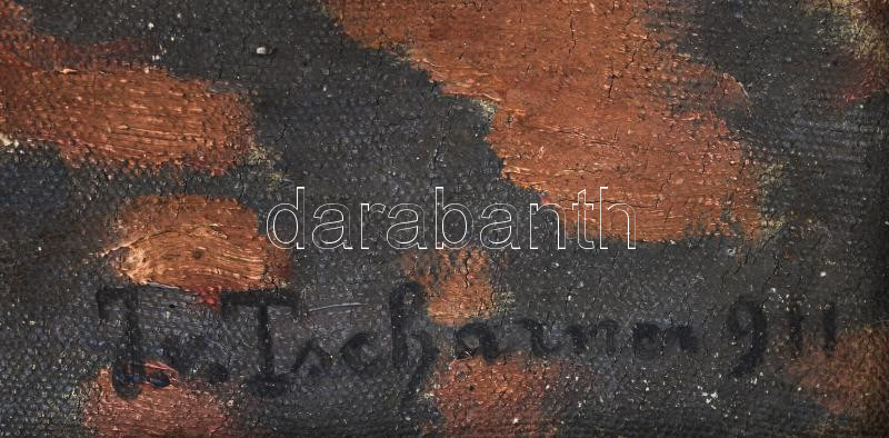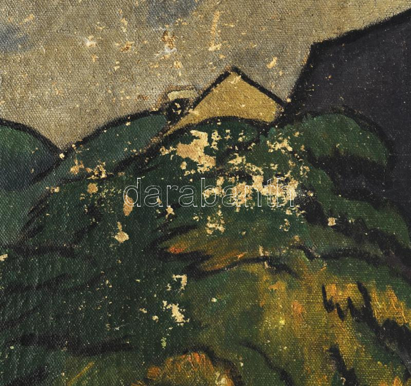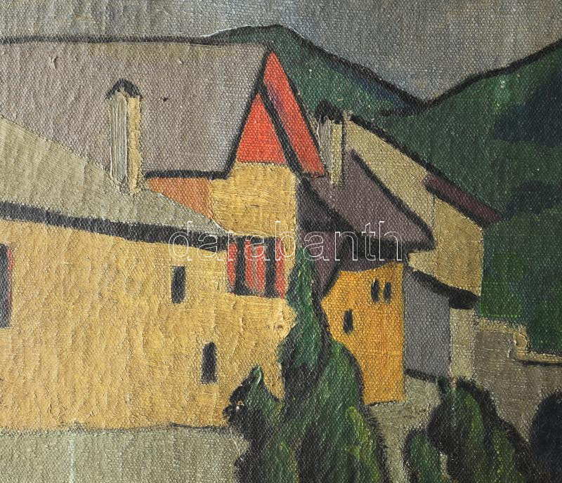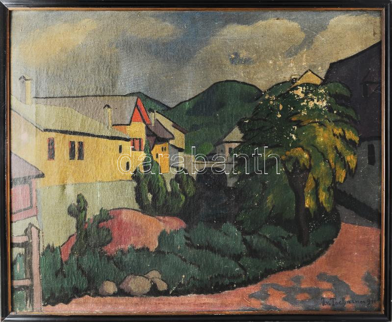 Tscharner János / Tscharner, Johann Wilhelm von (1886-1946): Kisvárosi utca (Felsőbánya vagy Nagybánya), 1911. Olaj, vászon, jelezve jobbra lent: J. v. Tscharner 911. Hátoldalán korabeli "Kisvárosi utca" és "200 K" (Korona) feliratokkal. Felületi sérülésekkel, kopásokkal. Fakeretben. 60x75 cm. Tscharner Lembergben született, nagyapja Svájcból vándorolt ki a mai ukrán városba. Tscharner filozófiai tanulmányokat kezdett Krakkóban, majd azt feladva Hollósy Simon tanítványa lett Münchenben 1907-ben. Nagybányán és Felsőbányán képezte magát tovább 1907 és 1914 között, a téli időszakokban Párizsban Matisse tanítványa volt, később Svájcban élt. Az aukción szereplő festményünk 1911-ben készült és stílusában, expresszív színvilágával a fauve festők és a nagybányai neósok, elsősorban Ziffer Sándor műveivel állítható párhuzamba. Feszes kompozíciója és összefoglaló festésmódja alapján megállapítható, hogy Tscharner az 1910-es évek elejére már növendék tudását és státuszát meghaladva, egy érett, biztos kezű művésszé vált. E mellett szól az is, hogy az 1911-ben megalakult Nagybányai Festők Társasága törzstagjai közt szerepelt. Ezen festmény felbukkanása egy ritka alkalom a nagybányai és a modern magyar magyar festészet gyűjtői számára: Tudomásunk szerint Magyarországon az utóbbi 30 évben egyszer szerepelt Tscharner alkotás aukción. Nagybányai korszakából rendkívül kevés festmény ismert, becses gyűjtői ritkaság!/ Tscharner, Johann Wilhelm von (1886-1946, born in Lemberg, now Ukraine, with Swiss ancestors): Street (Baia Sprie or Baia Mare), 1911. Oil on canvas, signed lower right: J. v. Tscharner 911. With surface damages. Framed. 60x75 cm. Very rare painting from the modern era period of painting in Baia Mare!