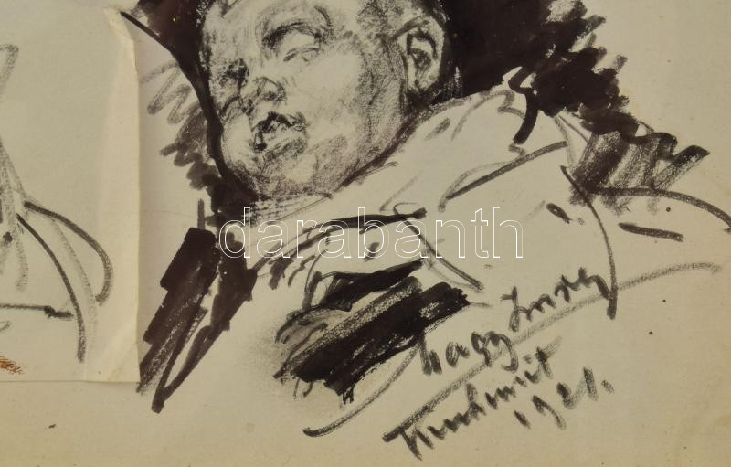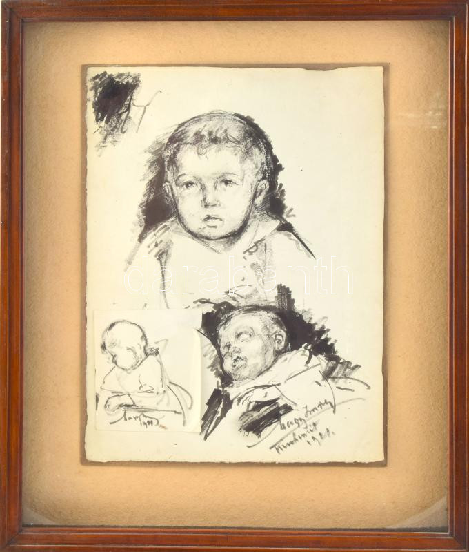Zsögödi Nagy Imre (1893-1976), 3 db rajz: Kisfiú arcképe, 1921. Tus, papír. Jelzett. Hátoldalán "Laci fiam" felirattal. Kisebbik méretű rajz a nagyobb bal alsó sarkába ragasztva. 26x20 és 8x7 cm. Üvegezett fakeretben.