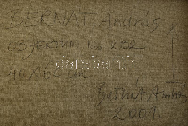 Bernát András (1957-): Objektum No. 232., 2001. Olaj, vászon, jelzett ... https://www.darabanth.com/de/45-Gross-Auktion/45.1/Gemalde-und-Grafiken/Zeitgenossische-Gemalde-und-Grafiken~18998/Bernat-Andras-1957-Objektum-No-232-2001-Olaj-vaszon-jelzett-a-hatoldalan-Provenienci~II3445615