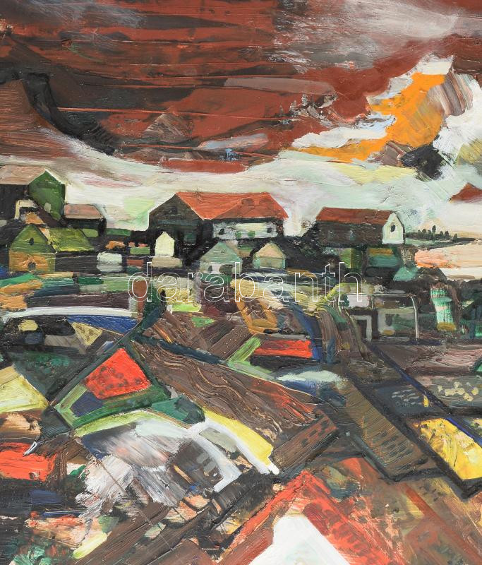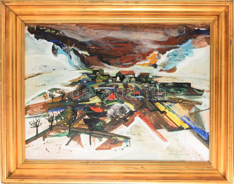 Ifj. Guti József Soma (1946-): A tél színei, 1977. Olaj, farost, jelezve jobbra lent. Hátoldalán Képcsarnok Vállalat címkéjével és autográf felirattal. Dekoratív, kissé sérült fakeretben. 60x80 cm.