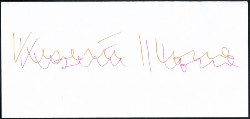 Beschreibung: Keserü Ilona (1933-): Kalligrafikus aláírás (Saját kiállítása meghívójának hátoldalán). Filctoll, papír, jelzett. 10x21 cm.
