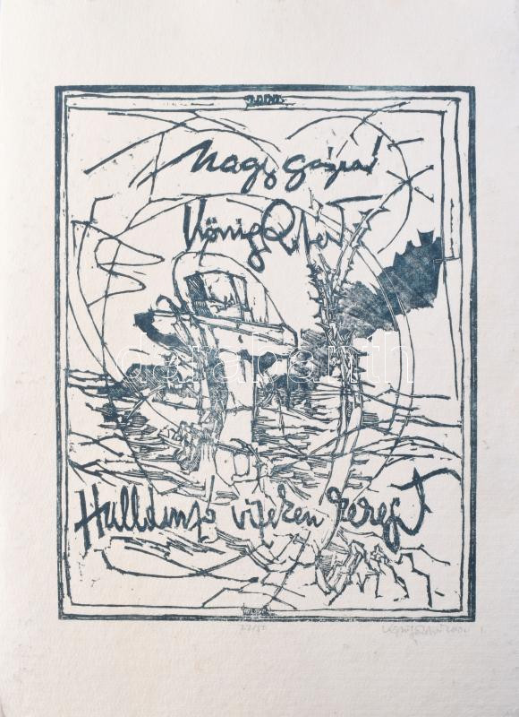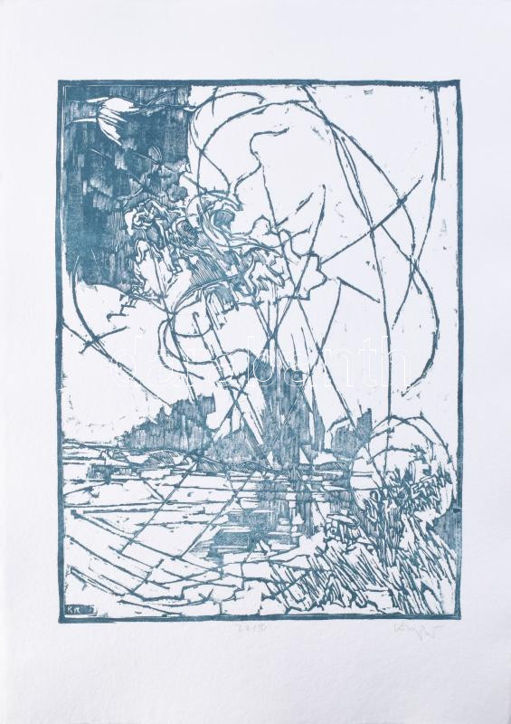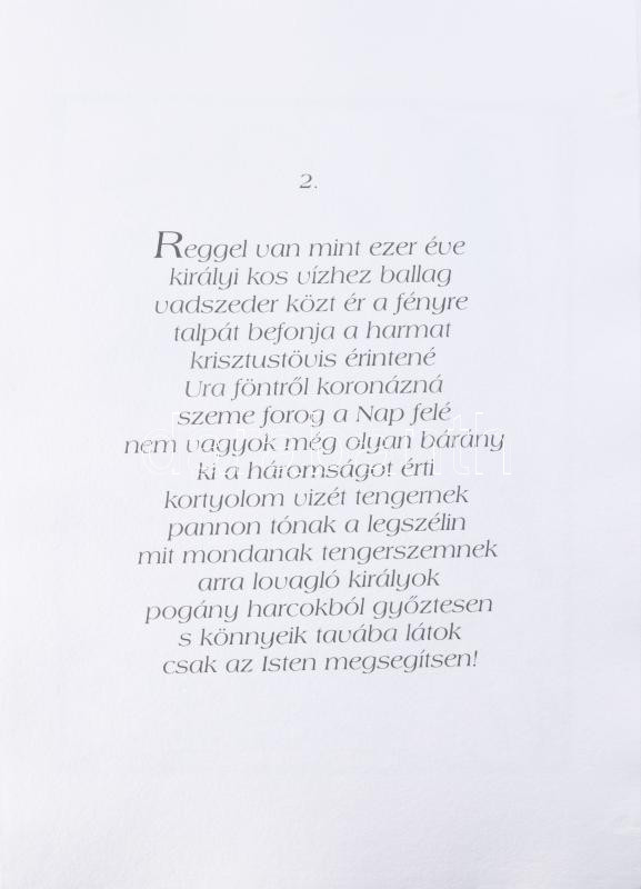 König (Kőnig) Róbert (1951-2014), Nagy Gáspár (1949-2007): Hullámzó vizeken kereszt. König (Kőnig) Róbert 12 db grafikája, Nagy Gáspár költő verseihez. Linómetszet, merített papír, mindegyik jelzett és számozott (22/50). Kiadói, számozott és König Róbert által jelzett mappában. Előzéklapon König Róbert által dedikált! Készült Szentendrén, Vincze Papírmerítő Műhelyben valamint König Róbert grafikus műtermében, Budapest, 2000 májusában. Komplett, hiánytalan, kiadói mappán apró foltokkal, máskülönben jó állapotban!