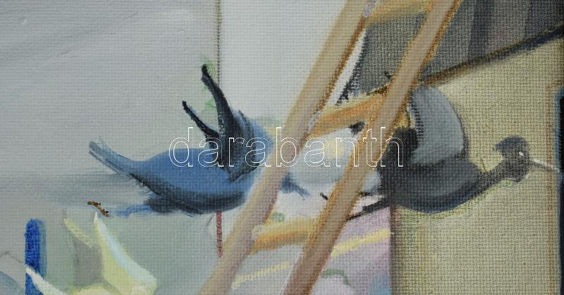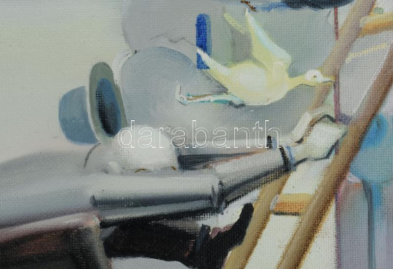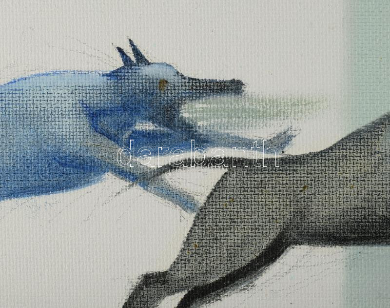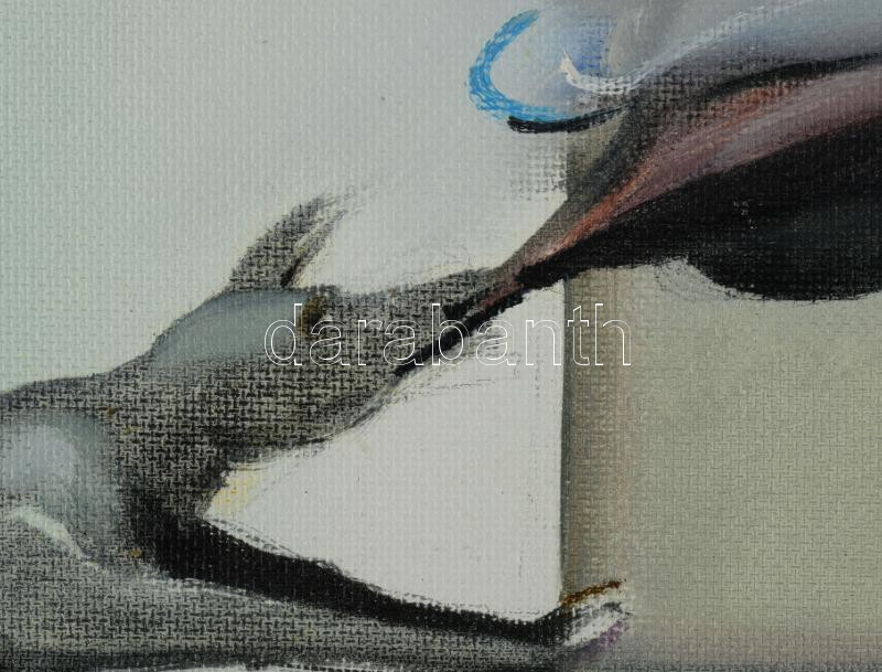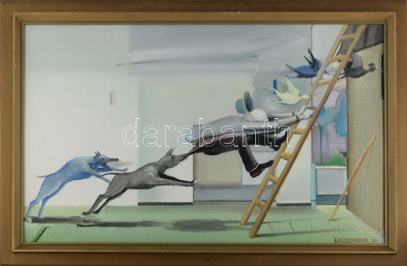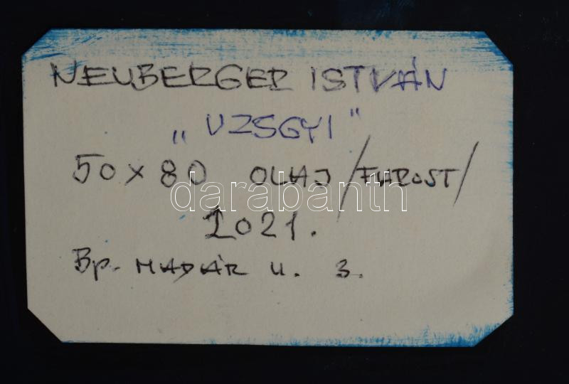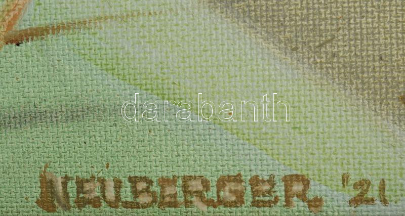 Neuberger István (1953-): "Uzsgyi", 2021. Olaj, farost. Jelezve jobbra lent: Neuberger 21. Hátoldalán címkén Neuberger István autográf feliratával. Dekoratív, kissé kopott fakeretben. 50x80 cm