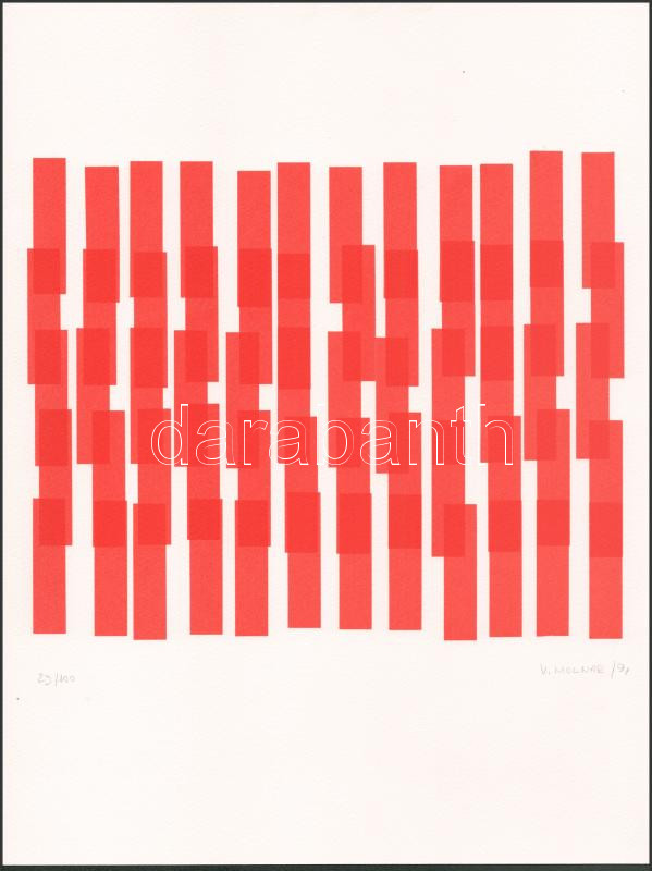 Vera Molnár (1924-2023): Piros négyzetek (cím nélkül), 1991. Szitanyomat, papír. Jelzett. Számozott: 29/100. Az 1991-ben megjelent Gépeltérítés-Képelterítés mappából (Magyar Műhely, Párizs). 22,5x27,5 cm
