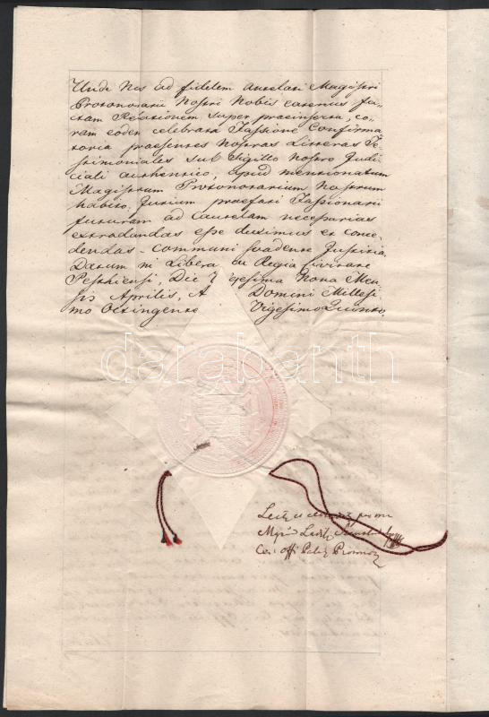 az utolsó oldalon későbbi 1851-es bejegyzéssel, Pesten, Szentkirályi László magiszter aláírásával, papírfelzetes viaszpecséttel, latin és magyar nyelven,3 sztl. lev.