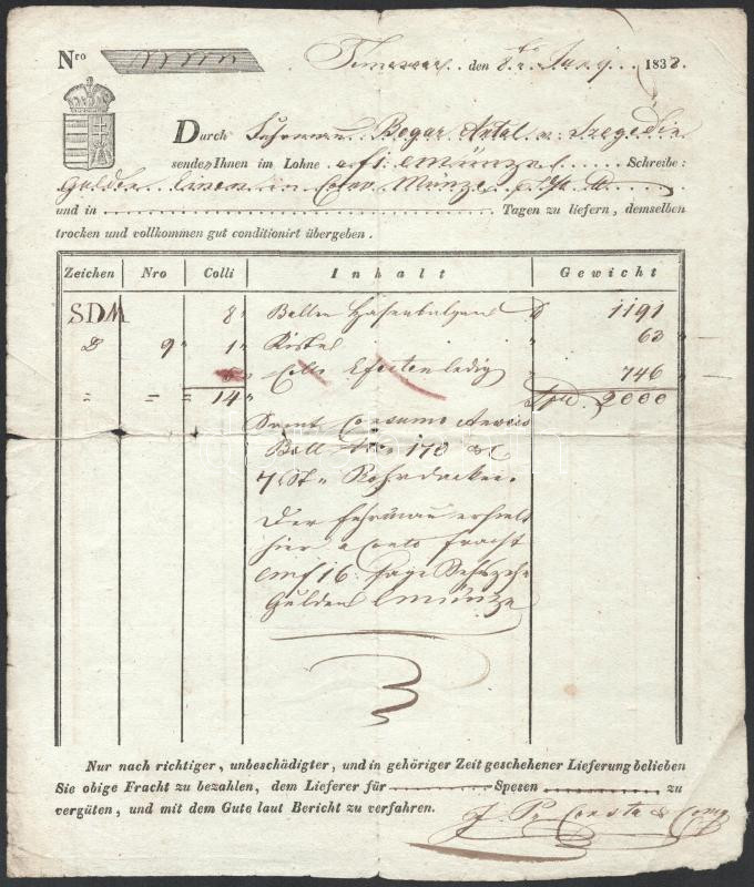 1838 Temesvár, vasúti fuvarlevél, szakadással https://www.darabanth.com/de/45-Gross-Auktion/45.1/Kunst-Dokumente-andere-Sammelgebiete/Dokument~18546/1838-Temesvar-vasuti-fuvarlevel-szakadassal~II3447951