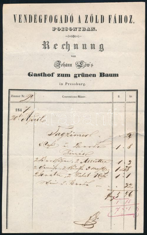 1847 A pozsonyi (Felvidék) Vendégfogadó a Zöld fához kitöltött napi sz... https://www.darabanth.com/de/45-Gross-Auktion/45.1/Kunst-Dokumente-andere-Sammelgebiete/Dokument~18546/1847-A-pozsonyi-Felvidek-Vendegfogado-a-Zold-fahoz-kitoltott-napi-szamlaja-javitassal~II3446472