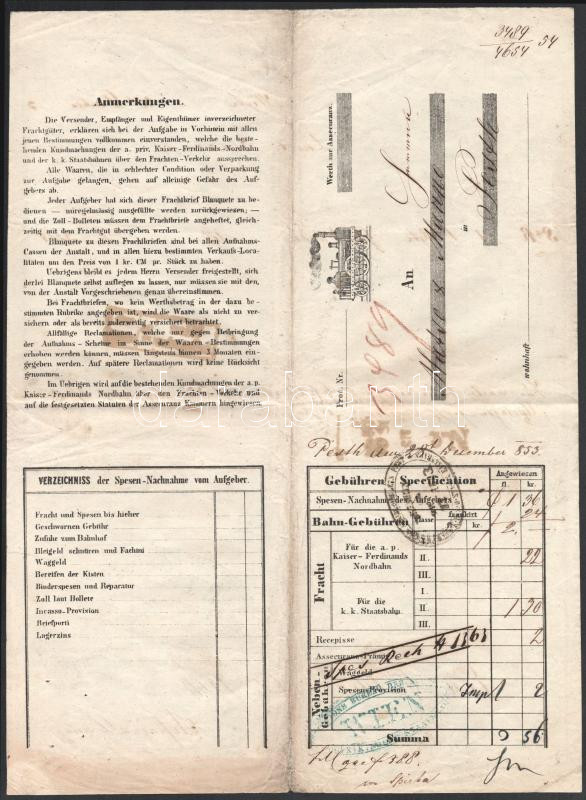 1853 Wien, Ausschl. Pr. Kaiser-Ferdinands-Nordbahn vasúti fuvarlevél https://www.darabanth.com/de/45-Gross-Auktion/45.1/Kunst-Dokumente-andere-Sammelgebiete/Dokument~18546/1853-Wien-Ausschl-Pr-Kaiser-Ferdinands-Nordbahn-vasuti-fuvarlevel~II3447958