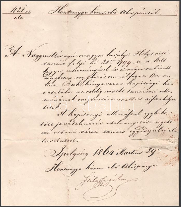 1864 Bakabánya (Hont vármegye) városi kapitányi kinevezés https://www.darabanth.com/de/45-Gross-Auktion/45.1/Kunst-Dokumente-andere-Sammelgebiete/Dokument~18546/1864-Bakabanya-Hont-varmegye-varosi-kapitanyi-kinevezes~II3447630
