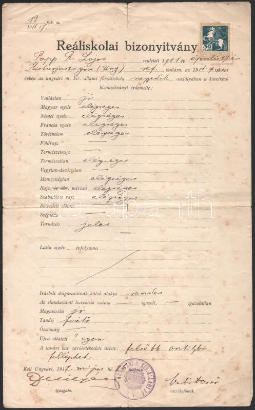 Beschreibung: 1917 Szabó Dezső író által kitöltött, aláírt iskolai bizonyítvány