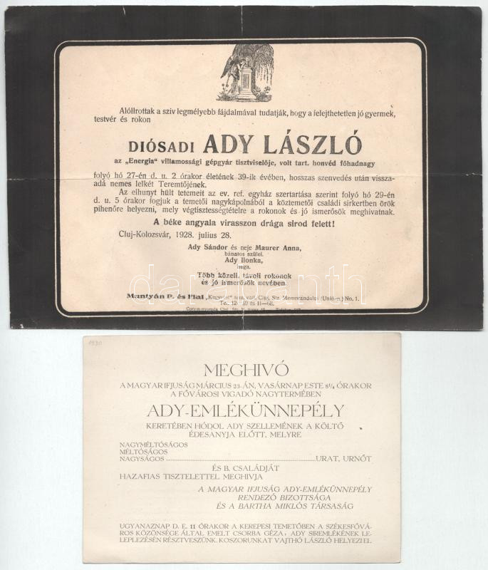 1928 dióasadi Ady László, Ady Endre testvérének halotti értesítője 24x... https://www.darabanth.com/de/45-Gross-Auktion/45.1/Kunst-Dokumente-andere-Sammelgebiete/Drucksachen~18978/1928-dioasadi-Ady-Laszlo-Ady-Endre-testverenek-halotti-ertesitoje-24x14-cm-plus-Meghivo-Ady-~II3420205