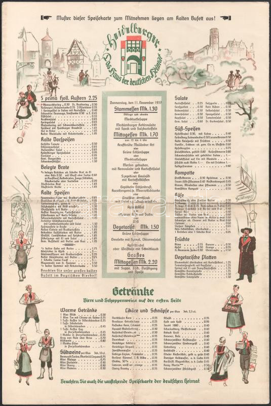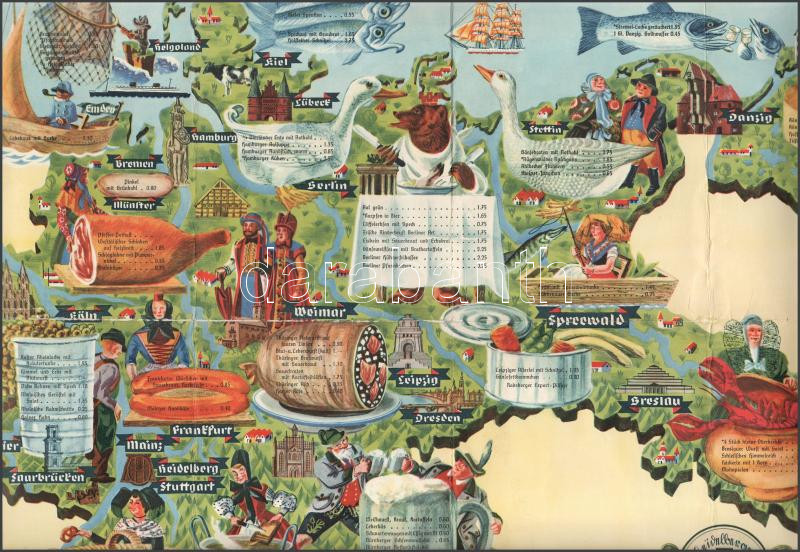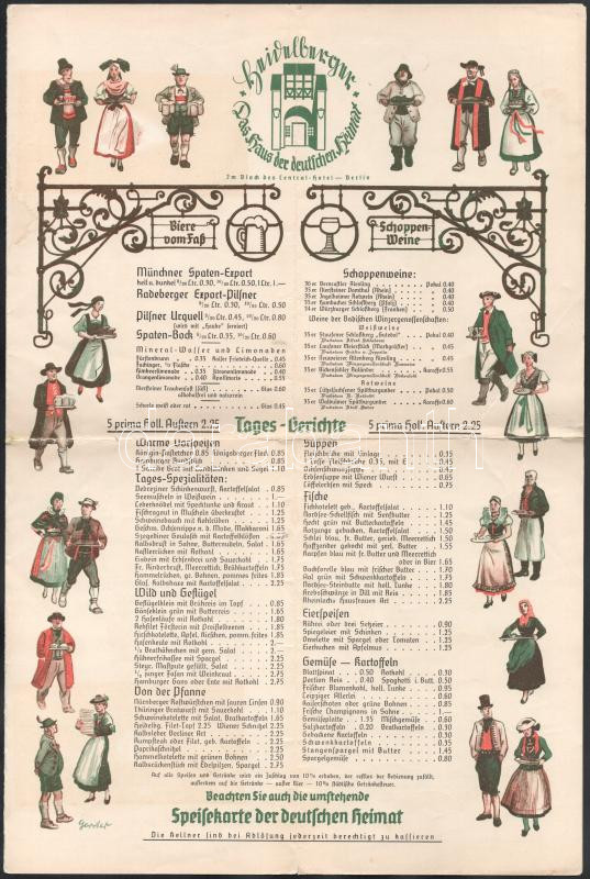 1934 Heidelberger, Das Haus der Deutschen Heimat, az itteni étterem ét- és itallapja, két nagyméretű kinyitható lap, középen a német haza képes étlapja, képekkel gazdagon illusztrált térképpel, jó állapotban, 42×56 cm