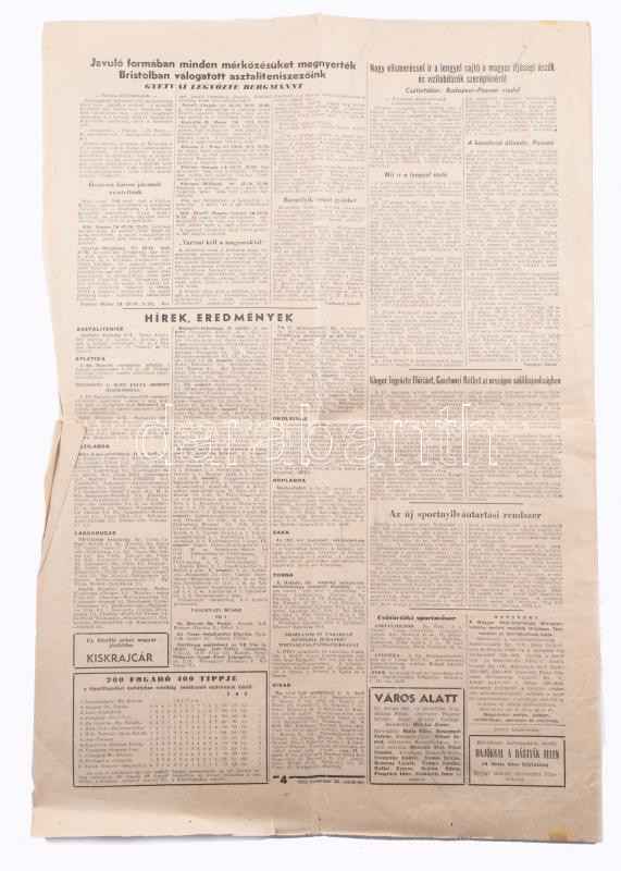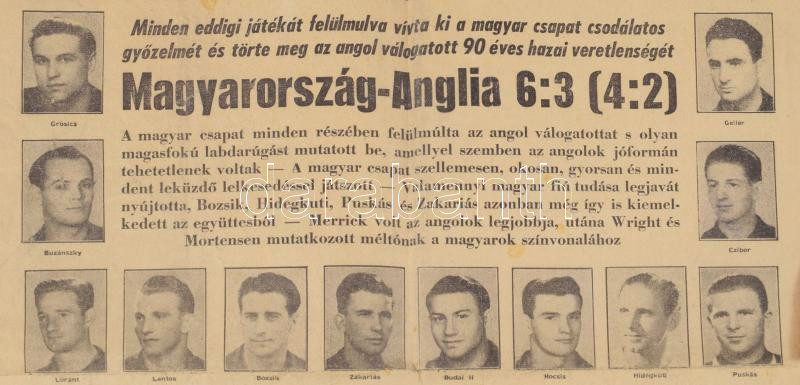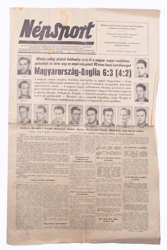 1953 Magyarország: Anglia 6:3. A legendás meccsről tudósító Népsport 1953. nov. 26., IX. évf. 236. száma. A címlapon az Aranycsapat tagjainak fotóival, beszámolóval. (Bp.),Szikra-ny., szakadt, hajtott, a szélein gyűrött, kissé foltos, 4 p.