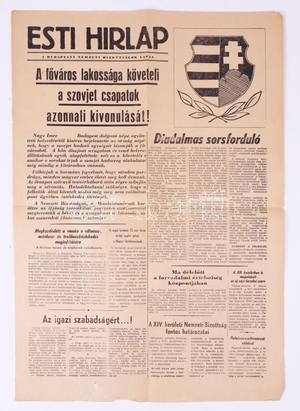 1956 Az Esti Hírlap, a Budapesti Nemzeti Bizottságok Lapjának forradalmi száma, címlapon "A főváros lakossága követeli a szovjet csapatok azonnali kivonulását!", hajtott, szakadással